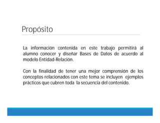 Este documento introduce el modelo entidad-relación para el diseño de bases de datos. Explica los conceptos clave como entidades, atributos, relaciones, cardinalidades, claves y restricciones. También cubre temas avanzados como entidades débiles, especialización, generalización y herencia de atributos. El objetivo es proveer a los estudiantes una comprensión teórica y práctica de este importante modelo conceptual para el diseño de bases de datos.