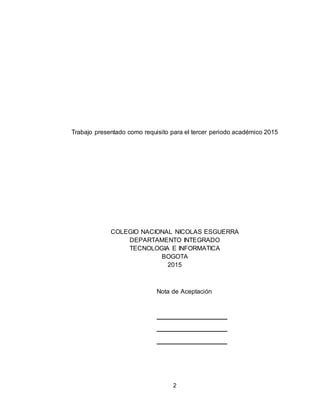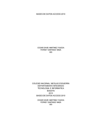 Este documento describe el proceso de creación de una base de datos en Microsoft Access para una empresa didáctica. Explica que Access permite crear tablas, consultas, formularios e informes para almacenar y presentar información de manera organizada. Luego, establece como objetivos generales diseñar las tablas y formularios de la base de datos de la empresa didáctica, crear informes que respondan a las necesidades de la empresa e implementar macros para optimizar los datos. Finalmente, define el problema de que la empresa maneja grandes volúmenes de inform