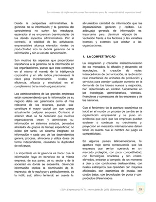 El documento discute cómo los sistemas de información pueden usarse como herramientas para aumentar la competitividad de las organizaciones. Explica que el conocimiento es la materia prima clave en la era actual y que las organizaciones deben repensar cómo gestionan la información para lograr mayor productividad e innovación a nivel global. También describe cómo la apertura de fronteras y las políticas económicas cambiantes están aumentando la exigencia de la competitividad.