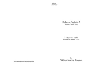 Este documento es un sermón del 1 de septiembre de 1957 dado por William Branham sobre el capítulo 3 de Hebreos. En el sermón, Branham comparte la historia de conversión de una mujer alcohólica llamada Rosella y cómo Dios la sanó y llamó al ministerio. Luego habla sobre cómo América ya no quiere el evangelio y está lista para el juicio, y cómo el único amor que quedará será entre el pueblo elegido de Dios.