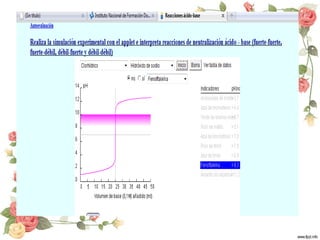 El documento resume conceptos clave sobre la neutralización de ácidos y bases. Explica que en la neutralización de un ácido fuerte con una base fuerte, el punto de equivalencia ocurre a pH 7 y es adecuado usar los indicadores azul de bromotimol o tornasol. En la neutralización de un ácido débil con una base fuerte, el punto de equivalencia es a pH > 7 y es mejor usar fenolftaleína o azul de timol. También compara la neutralización de un ácido fuerte con una base débil.