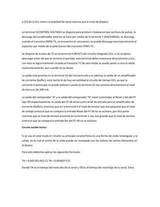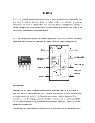 El circuito integrado 555 puede funcionar como un multivibrador astable para generar ondas cuadradas o como un circuito monoestable para generar pulsos únicos. Contiene comparadores de voltaje, un flip-flop y un transistor de descarga que permiten estas funciones mediante el uso de componentes externos como resistores y condensadores. Se utiliza comúnmente para controlar sistemas secuenciales, modulación por ancho de pulso y generación de tiempos de retardo.