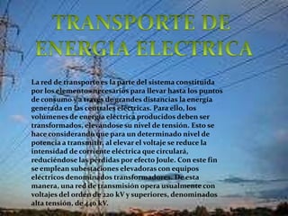 La red de transporte eléctrico transforma y eleva la tensión de la energía producida para reducir las pérdidas durante su transmisión a largas distancias a través de subestaciones y líneas de alta tensión. Las líneas de transmisión, constituidas por cables conductores y torres de soporte, transportan la energía a grandes distancias operando usualmente a voltajes de 220 kV o más.