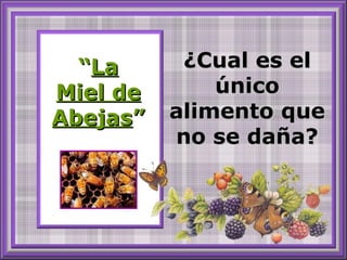 Este documento describe los beneficios para la salud de la miel de abejas y la canela. Indica que la miel de abejas no se daña y que cuando se mezcla con canela puede curar la mayoría de las enfermedades. Proporciona una lista de enfermedades específicas que pueden tratarse con una mezcla de miel y canela, como problemas cardíacos, picaduras de insectos, artritis, infecciones renales, dolor de dientes, resfriados y más. Recomienda tomar la mezcla diariamente para mejor
