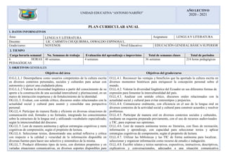 Este documento presenta el plan curricular anual para la asignatura de Lengua y Literatura del grado noveno en una unidad educativa ecuatoriana. Incluye información sobre los objetivos generales y específicos, el tiempo de duración de las clases, los ejes transversales y el desarrollo de las unidades de planificación. El plan contiene 6 unidades que abarcan temas como la historia de la escritura, la literatura mitológica, la lectura de textos, la escritura de cartas de lectores y la comunicación oral.