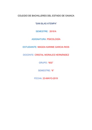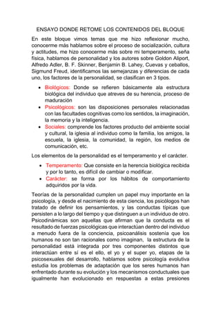 Este documento resume los principales puntos tratados en un bloque de psicología. Aborda temas como la socialización, la cultura, las actitudes y la personalidad. Explica los tres tipos de factores de la personalidad - biológicos, psicológicos y sociales - y los elementos de la personalidad, el temperamento y el carácter. Resume varias teorías de la personalidad como la psicoanalítica, la psicodinámica, la conductista, la humanista y la cognitivo-social. El estudiante concluye que el