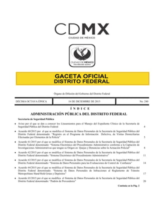 El documento presenta una serie de acuerdos de la Secretaría de Seguridad Pública del Distrito Federal relacionados con la modificación y creación de sistemas de datos personales, así como avisos sobre trámites, convocatorias de licitación y fallos. También incluye acuerdos de delegaciones político-administrativas sobre delegación de facultades.