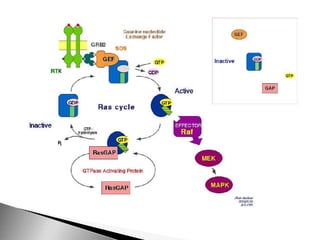 Este documento describe los diferentes tipos de comunicación celular, incluyendo la señalización endocrina, paracrina, autocrina e interacción directa. Explica cómo las moléculas señal se unen a receptores celulares específicos y activan cascadas de señalización que producen cambios en la expresión génica y función celular. También describe los principales tipos de receptores como los acoplados a proteínas G y los receptores con actividad tirosina quinasa.