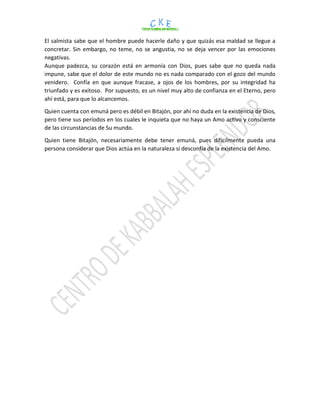 Emuná se refiere a la creencia o convicción en Dios basada en la búsqueda de la verdad a través del entendimiento y no de la fe ciega. Bitajón se refiere a la confianza y seguridad en la presencia y control de Dios sobre todas las cosas, aunque a veces los hombres no comprendan Sus designios. El salmista tiene Bitajón en Dios y no teme aunque los hombres le hagan daño, confiando en que Dios juzgará todo y que el gozo futuro compensará el dolor presente. Qui