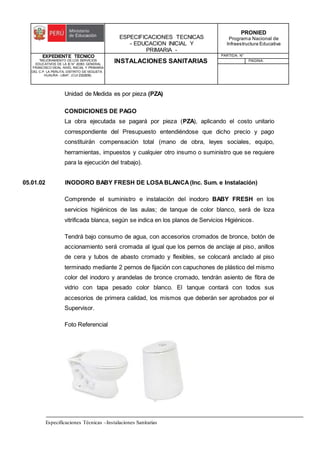 Este documento presenta las especificaciones técnicas para las instalaciones sanitarias de un proyecto de mejoramiento de servicios educativos. Describe 9 partidas relacionadas a suministros e instalación de inodoros, lavatorios, urinarios y accesorios para servicios higiénicos, con detalles como materiales, medidas y métodos de medición y pago. El objetivo es mejorar la infraestructura sanitaria de una institución educativa.