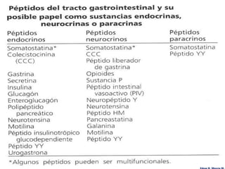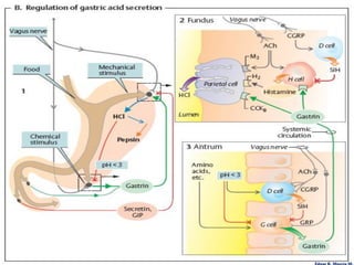 El documento describe el sistema digestivo, comenzando por la boca y la deglución, luego el estómago y sus funciones de secreción, digestión química y vaciado al intestino delgado. Explica los diferentes tipos de células gástricas y las enzimas estomacales como la pepsina y la lipasa. También describe las principales hormonas gástricas como la gastrina, la secretina y la colecistokinina, y sus funciones en la regulación de la secreción ácida y enzimática. Finalmente, menciona