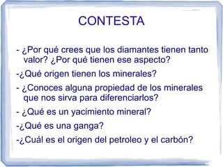 Este documento trata sobre los minerales. Explica que los minerales son sólidos formados por la combinación de elementos en la corteza terrestre y que constituyen las rocas. Describe las propiedades de los minerales como el color, brillo, dureza y su clasificación en grupos como silicatos, no silicatos, óxidos, sulfuros y carbonatos. Explica que los minerales pueden tener un origen magmático, sedimentario o metamórfico y cómo se extraen a través de canteras y minas, así como