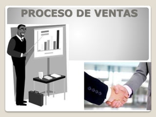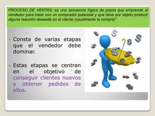 Este documento describe las cuatro etapas principales del proceso de ventas: 1) Prospección, que involucra la identificación y calificación de posibles clientes; 2) Acercamiento previo, que consiste en investigar a los clientes y preparar presentaciones adaptadas; 3) Presentación de ventas, donde se presenta el producto siguiendo la técnica AIDA; y 4) Actividades posventa para asegurar la satisfacción del cliente. También se mencionan algunas técnicas de venta comunes como la pregunta, la curiosidad y la vis