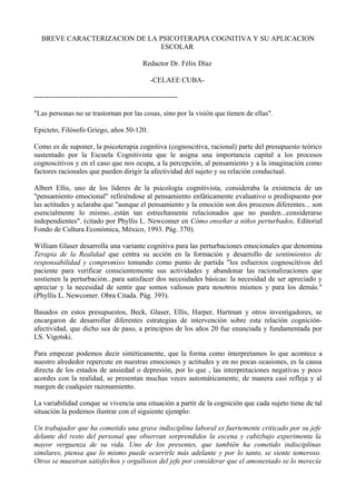 La psicoterapia cognitiva se basa en la premisa de que los procesos cognitivos como la percepción, el pensamiento y la imaginación influyen en la afectividad y la conducta de una persona. Se enfoca en identificar los pensamientos automáticos negativos de un individuo sobre ciertos eventos y reemplazarlos con pensamientos más realistas y positivos a través de la reestructuración cognitiva, con el objetivo de mejorar los estados emocionales como la ansiedad y la depresión. Esta técnica implica identificar