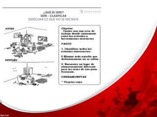 Las 5'S son una serie de procesos para lograr la calidad mediante el mantenimiento integral en una organización. Surgen después de la Segunda Guerra Mundial para mejorar la calidad en Japón. Las 5 etapas son: clasificación y descarte de elementos (Seiri), organización de elementos (Seiton), limpieza (Seiso), establecimiento de hábitos de higiene y visualización (Seiketsu), y compromiso y disciplina (Shietsuke). El objetivo general es mejorar las condiciones de trabajo, reducir gastos y riesgos, e increment