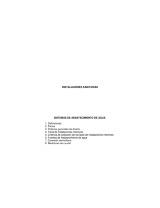 El documento describe los diferentes sistemas de abastecimiento de agua para instalaciones sanitarias interiores. Explica los tipos de sistemas directos, indirectos y combinados, incluyendo sus componentes y ventajas y desventajas. También cubre criterios de diseño y selección del sistema apropiado dependiendo de factores como la presión del agua, altura del edificio y necesidades del cliente.