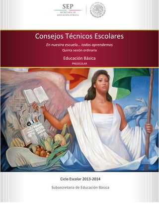 Este documento presenta la guía para la quinta sesión ordinaria del Consejo Técnico Escolar del ciclo escolar 2013-2014 para educación preescolar. La sesión tiene como propósito evaluar los avances en atender las prioridades del sistema de mejora y analizar el desempeño de los alumnos y su relación con la intervención docente. La sesión consta de dos momentos: 1) revisar los compromisos adquiridos en la sesión anterior y 2) reflexionar sobre los aprendizajes de los alumnos y cómo mejor