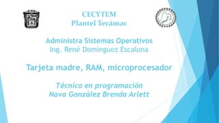 Este documento describe tres componentes clave de una computadora: la tarjeta madre, la RAM y el microprocesador. Explica que la tarjeta madre conecta todos los componentes y contiene el chipset y BIOS. La RAM almacena temporalmente datos e instrucciones para el procesador. El microprocesador ejecuta instrucciones como sumar y multiplicar y es conocido como el "cerebro" de la computadora. El documento concluye que estos tres componentes son esenciales para el funcionamiento de una computadora.