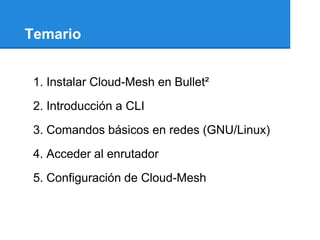 El documento proporciona instrucciones para configurar una red mesh utilizando Cloud-Mesh. Explica cómo instalar Cloud-Mesh en un enrutador Bullet, acceder al enrutador a través de SSH, y usar un script de configuración para cambiar la configuración básica como los nombres de las redes, configurar el tráfico shaping, el portal cautivo y el servidor de visualización.