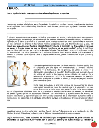 Este documento contiene la evaluación de un alumno de 5° grado en diferentes asignaturas como Español, Matemáticas, Ciencias Naturales, Historia, Geografía y Formación Cívica y Ética para el cuarto bimestre. Incluye el número de aciertos y la calificación obtenida en cada materia.