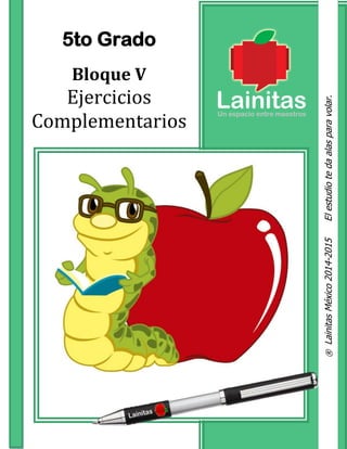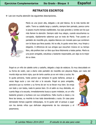 Este documento presenta ejercicios complementarios para el quinto grado de primaria. Incluye descripciones de dos personajes llamados María y Ángel, con instrucciones para identificar adjetivos y adverbios en las descripciones. También presenta información sobre la numeración maya y ejercicios de matemáticas relacionados con suma, resta, multiplicación y división.