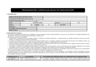 El documento describe los objetivos y competencias del área de comunicación para el quinto año de secundaria, enfocándose en la consolidación de logros previos y el desarrollo de habilidades de escucha, comprensión y producción de textos. Se enfatiza la importancia de las TIC para lograr un aprendizaje significativo y se establecen criterios de evaluación basados en estándares claros para mejorar la comunicación oral y escrita de los estudiantes. Además, se mencionan enfoques transversales como el de derechos, inclusión, interculturalidad y igualdad de género para promover un entorno educativo equitativo y respetuoso.