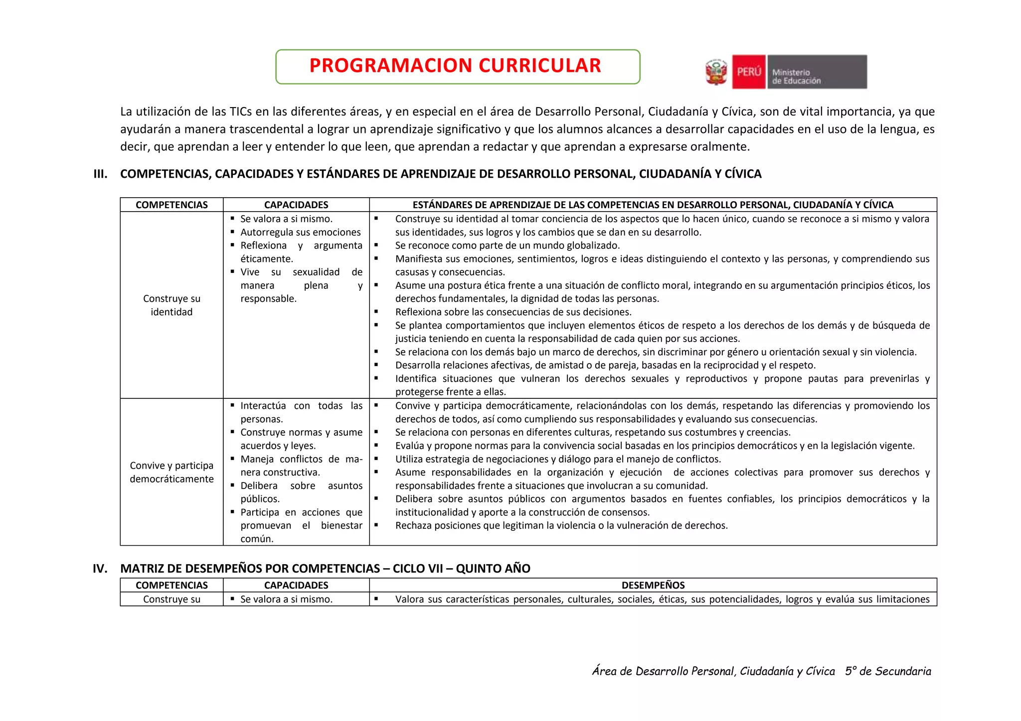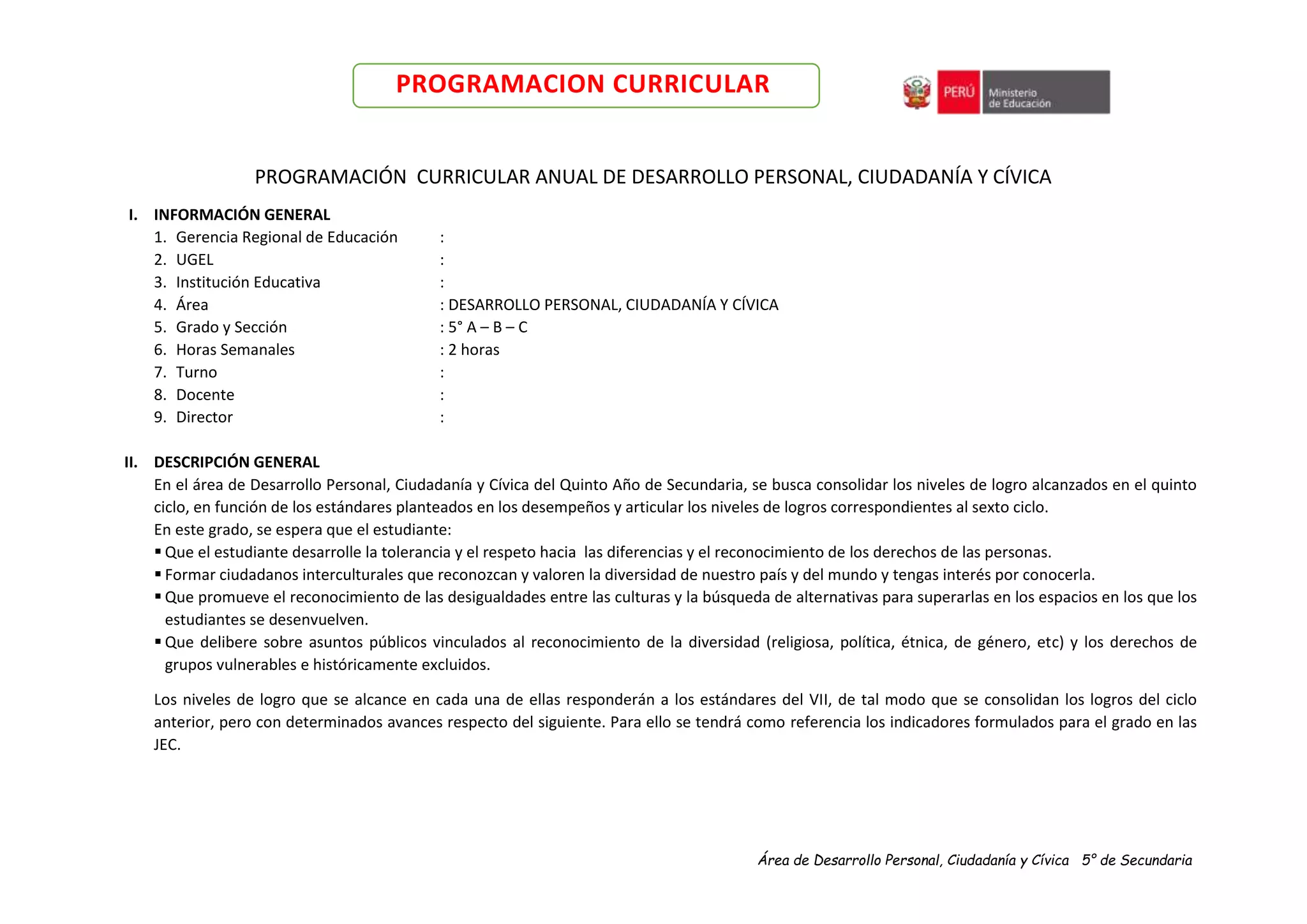 Este documento presenta la programación curricular anual para el área de Desarrollo Personal, Ciudadanía y Cívica del 5° grado de secundaria. Se describen las competencias, capacidades y estándares de aprendizaje que los estudiantes deben desarrollar en el año escolar. El objetivo es que los estudiantes consoliden los niveles de logro alcanzados en el quinto ciclo y articulen los aprendizajes con el sexto ciclo, demostrando tolerancia, respeto a la diversidad y participación democrática
