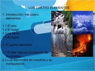 El documento habla sobre los cuatro elementos clásicos - aire, fuego, tierra y agua - y su relación con el quinto elemento, el éter. Explica que cada elemento representa un aspecto de la vida: el aire representa la renovación del conocimiento, el fuego representa el nacimiento, el agua representa el flujo de la vida y la tierra representa la producción. También describe cada elemento y sus propiedades así como su presencia en el cuerpo humano. Finalmente, explica que el cuarto chakra o chakra cardíaco está relacion