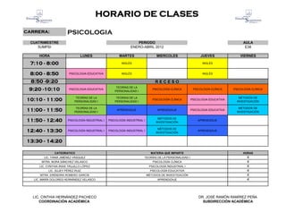 Este documento presenta el horario de clases de la carrera de Psicología para el cuatrimestre de enero a abril de 2012. El horario detalla las materias que se impartirán cada día de la semana, los profesores a cargo de cada asignatura y el número de horas que enseñarán. Las materias incluyen Teorías de la Personalidad I, Psicología Clínica, Aprendizaje, Psicología Educativa, Psicología Industrial I y Métodos de Investigación.