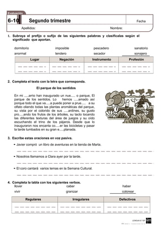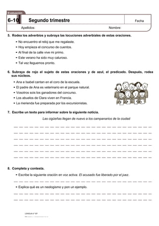 Este documento es una evaluación de lengua para el segundo trimestre de 6o curso de primaria. Contiene 8 preguntas que evalúan diferentes aspectos lingüísticos como la identificación y clasificación de prefijos y sufijos, la completación de textos con palabras faltantes, la transformación de oraciones de voz activa a pasiva, el uso de verbos regulares e irregulares, la identificación de elementos oracionales como sujeto, predicado, adverbios y locuciones adverbiales, y la redacción de un texto informativo y la explic