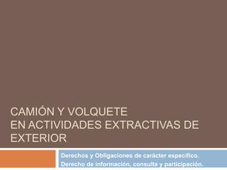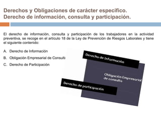 Este documento describe los derechos de información, consulta y participación de los trabajadores en materia de prevención de riesgos laborales según la ley española. Incluye el derecho a que los trabajadores reciban información sobre los riesgos y medidas preventivas de su puesto de trabajo, la obligación del empresario a consultar con los trabajadores sobre cuestiones relacionadas con la seguridad y salud laboral, y el derecho de los trabajadores a participar en la gestión de la seguridad a través de delegados y comités.