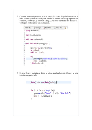 Este documento presenta un programa que permite ingresar las notas de varios alumnos y calcular el promedio de un alumno elegido usando arreglos unidimensionales. El programa primero crea un arreglo para almacenar las notas ingresadas por teclado, luego suma todas las notas y calcula el promedio. Finalmente, muestra la media y las notas superiores a la media.