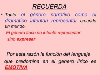 El documento proporciona información sobre el género lírico y sus características fundamentales. El género lírico se caracteriza por expresar los sentimientos del poeta a través de un hablante lírico. Incluye elementos como el poeta, el hablante lírico, los motivos y objetos líricos, y hace uso de recursos como las rimas, figuras literarias y métrica.
