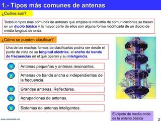 Este documento describe los tipos más comunes de antenas, clasificados según su longitud eléctrica, el ancho de banda de frecuencias en el que operan y su inteligencia. Describe antenas pequeñas como el dipolo corto y antenas resonantes como el dipolo de media longitud de onda, así como antenas de banda ancha como la log-periódica e incluye detalles sobre grandes antenas reflectoras como la parabólica.