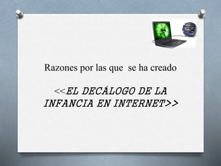 Este documento presenta un decálogo de los derechos electrónicos de los niños en internet. El decálogo establece 10 derechos clave como el acceso a la información y tecnología sin discriminación, la protección contra la explotación y abusos, y el derecho al desarrollo personal a través de las nuevas tecnologías. También destaca la responsabilidad de los padres de orientar a sus hijos sobre el uso responsable de internet y la necesidad de cooperación internacional para facilitar el acceso a la tecnología.