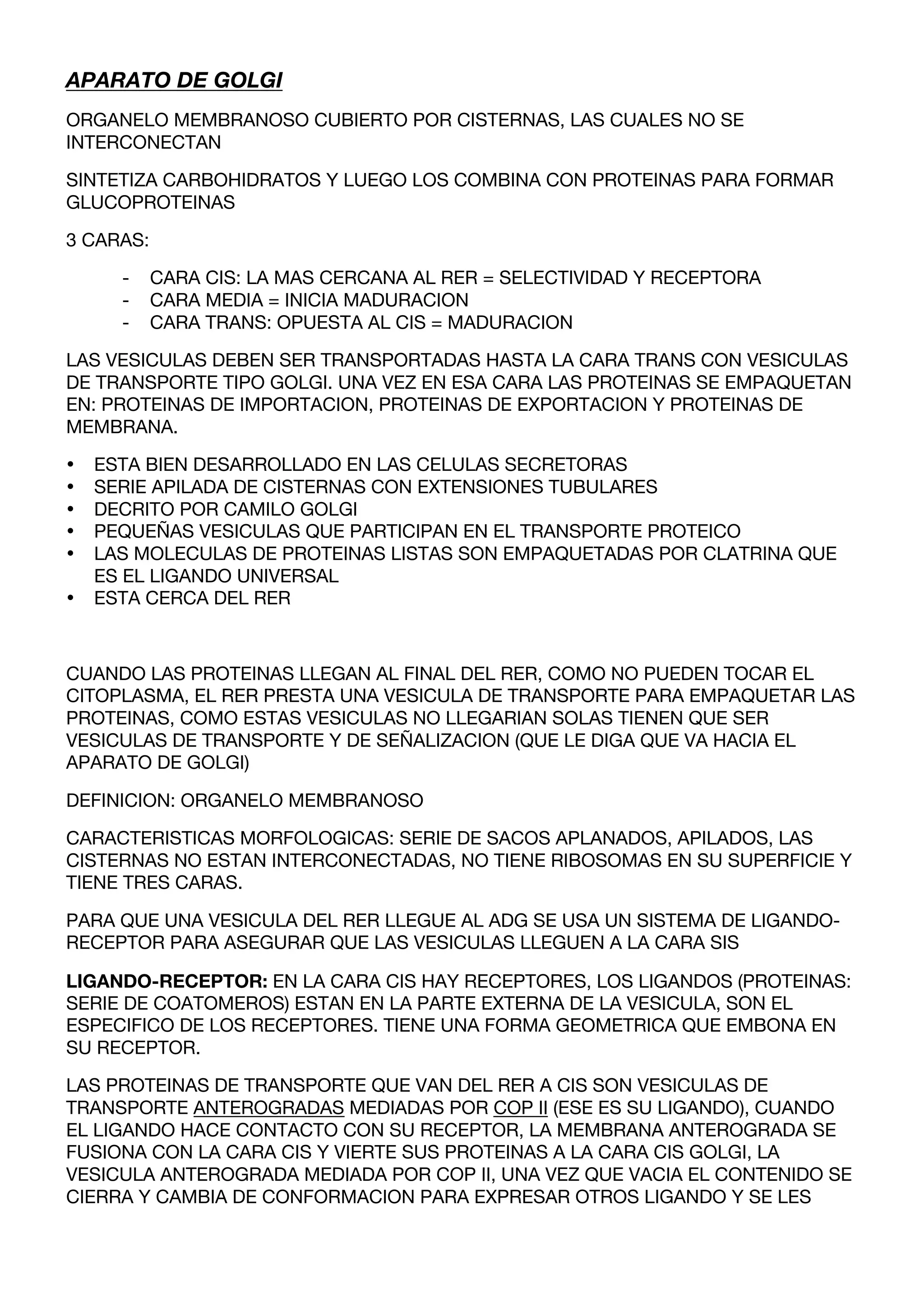El aparato de Golgi es un orgánulo donde se sintetizan, modifican y empaquetan proteínas. Está compuesto por cisternas apiladas con tres caras que cumplen funciones diferentes: la cara cis es receptora de proteínas del retículo endoplásmico, la cara media inicia la maduración de proteínas, y la cara trans empaqueta proteínas para su transporte. Las proteínas se mueven entre las caras usando vesículas de transporte del aparato de Golgi.