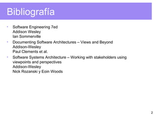Este documento presenta una introducción a la arquitectura de software. Explica conceptos como estilos arquitectónicos, patrones de diseño e idioms. Describe estilos como cliente-servidor, capas jerárquicas y tubos y filtros. También cubre la importancia de documentar la arquitectura y como esta afecta requisitos como rendimiento, seguridad y mantenibilidad.