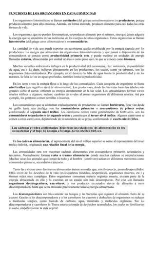 Los organismos fotosintéticos u organismos productores generan alimento para sí mismos y otros organismos mediante la fotosíntesis. Los organismos heterótrofos o consumidores no pueden producir su propio alimento y dependen de los productores u otros organismos para alimentarse. La energía fluye a través de las redes alimentarias en diferentes niveles tróficos, con los productores en el primer nivel y los consumidores en los niveles superiores. Los descomponedores desempeñan un papel clave al descomponer la materia