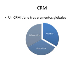 El documento habla sobre el CRM analítico y la minería de datos. El CRM analítico usa un modelo único de datos de clientes y herramientas tecnológicas para conocer mejor a los clientes. La minería de datos usa técnicas para encontrar patrones en grandes bases de datos que expliquen el comportamiento de los datos. Algunas técnicas son la asociación, clasificación, conglomerados y pronósticos.