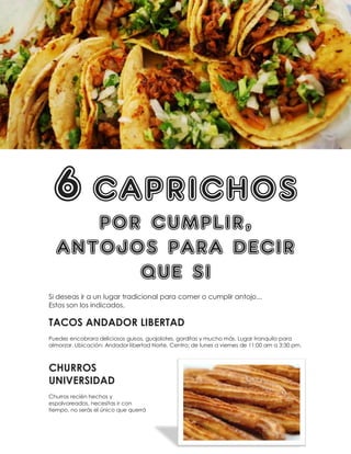 El documento presenta seis lugares recomendados para satisfacer antojos gastronómicos en Querétaro, incluyendo tacos, churros y pozole. Cada lugar ofrece horarios específicos y especialidades que destacan su tradición y calidad. Se sugiere visitar estos lugares para disfrutar de una experiencia culinaria local única.