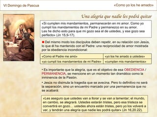 Jesús exhorta a sus discípulos a amarse los unos a los otros como él los ha amado. Les dice que ya no son servidores, sino amigos, porque les ha revelado todo lo que oyó de su Padre. Jesús los eligió para que den fruto duradero mediante el amor mutuo, siguiendo su ejemplo de obedecer los mandamientos del Padre.