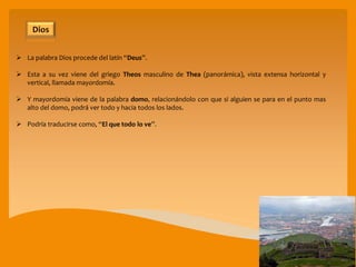 Este documento describe diferentes aspectos de la palabra "Dios" y su significado según las Escrituras. Explica que la palabra procede del latín "Deus" y del griego "Theos", y que se refiere al "Altísimo Viviente". También explora los términos hebreos "Elohim" y "Yehovah", y describe la organización celestial mencionada en la Biblia.