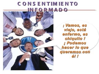 El consentimiento informado es un proceso de comunicación entre el profesional de la salud y el paciente donde se entrega información adecuada, comprensible y suficiente sobre un procedimiento médico para que el paciente pueda tomar una decisión libre. El consentimiento informado respeta la autonomía del paciente, promueve su participación en el cuidado de la salud y optimiza la relación médico-paciente. Para ser válido, el consentimiento informado requiere información, voluntariedad y competencia del paciente.