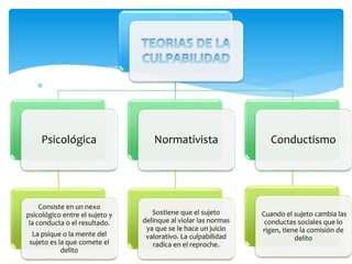 El documento discute los conceptos de culpabilidad e inculpabilidad en el derecho penal. Explica que la culpabilidad consiste en el nexo intelectual y emocional entre el sujeto y el acto delictivo y tiene elementos como la exigibilidad de una conducta conforme a la ley y la imputabilidad. Se presentan las formas de culpabilidad como el dolo y la culpa, así como sus elementos constitutivos. Finalmente, define la inculpabilidad como la falta del nexo causal emocional entre el sujeto y su acto, y enumera causas como