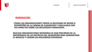 Este documento describe la importancia de medir el desempeño de la cadena de suministro y su impacto en los resultados financieros de una organización. Explica que existen tres categorías principales para medir el desempeño: tiempo, calidad y costo. Además, detalla algunas métricas clave relacionadas con instalaciones, inventario, transporte, información, aprovisionamiento y fijación de precios que afectan la capacidad de respuesta y eficiencia de la cadena de suministro.