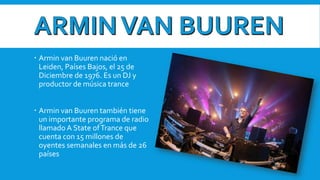 Este documento proporciona información biográfica sobre varios destacados DJs y productores de música electrónica como Armin van Buuren, David Guetta, Tijs Verwest, Skrillex, Avicii y Paul van Dyk. Detalla aspectos como su lugar y fecha de nacimiento, géneros musicales con los que se han destacado, logros profesionales y reconocimientos recibidos.