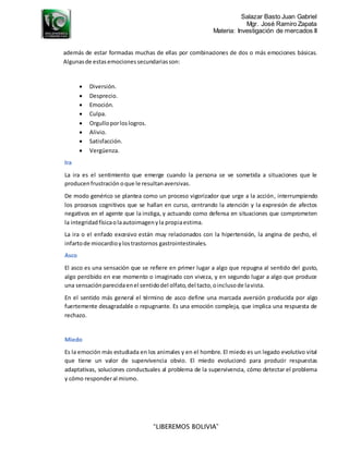 El documento resume los estudios del psicólogo Paul Ekman sobre las seis emociones básicas: ira, alegría, sorpresa, asco, tristeza y miedo. Ekman descubrió que estas emociones y sus expresiones faciales asociadas son universales en todas las culturas. También identificó emociones secundarias más complejas y que no siempre vienen definidas por una sola expresión facial. El documento luego profundiza en la definición y características de cada una de las seis emociones básicas.
