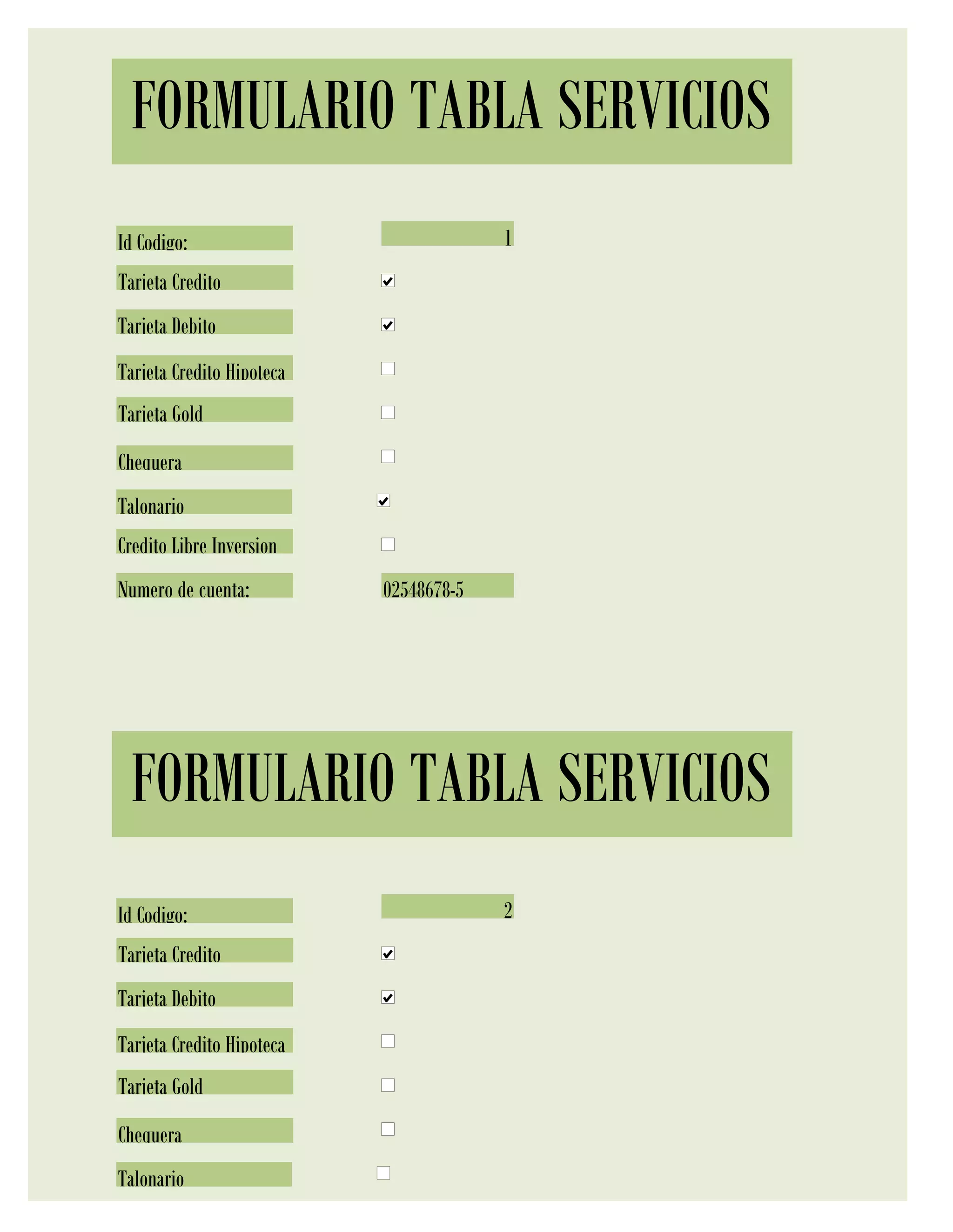 El documento contiene 21 formularios de tabla de servicios bancarios. Cada formulario incluye los mismos 7 servicios bancarios (tarjeta de crédito, tarjeta de débito, tarjeta de crédito hipotecaria, tarjeta gold, chequera, talonario, crédito libre de inversión) junto con un número de cuenta único.