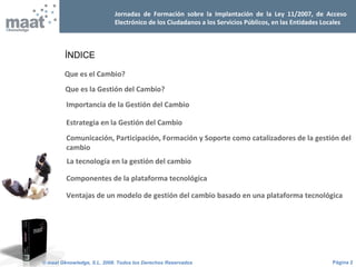 Este documento describe la importancia de la gestión del cambio en la implantación de sistemas de información para cumplir con la Ley 11/2007 sobre el acceso electrónico de los ciudadanos a los servicios públicos. Explica que la gestión del cambio implica procesos para asegurar que los cambios se implementen de forma ordenada y sistemática. Además, destaca que la comunicación, participación, formación y soporte técnico son elementos clave para gestionar con éxito el cambio, y que una plataforma tecnológica integrada