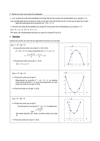 El documento explica los elementos característicos de las parábolas representadas por funciones cuadráticas del tipo y=ax^2+bx+c. Define el vértice, los puntos de corte con los ejes, y el eje de simetría. Muestra ejemplos de cómo calcular estos elementos y representar gráficamente parábolas a partir de su ecuación. Finalmente, plantea actividades para practicar el análisis y representación de parábolas.